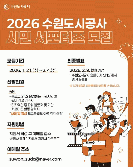 [NWS¹æ¼Û=Çѽ¸ñ ±âÀÚ]¼ö¿øµµ½Ã°ø»ç°¡ 21ÀϺÎÅÍ ´ÙÀ½ ´Þ 4ÀϱîÁö 2026³âµµ Á¦8±â ½Ã¹Î ¼­Æ÷ÅÍÁ ¸ðÁýÇÑ´Ù. ¼ö¿ø½Ã¹Î°ú ¼ö¿ø Áö¿ª Á÷ÀåÀÎÀÌ¸é ½Åû °¡´ÉÇϸç, °³ÀÎ ºí·Î±× ¹× SNS µîÀ» ¿î¿µÇϰųª °ø°ø±â°ü ¼­Æ÷ÅÍÁî °æ·ÂÀÚ´Â ¿ì´ëÇÑ´Ù¡¦