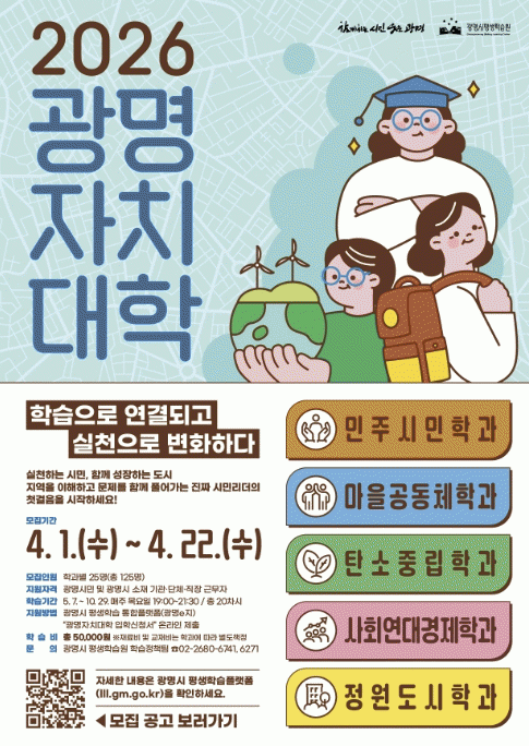 [NWS¹æ¼Û=Çѽ¸ñ ±âÀÚ]±¤¸í½Ã°¡ ½ÃÀÇ ÇÙ½ÉÀÇÁ¦ÀÎ Æò»ýÇнÀ ¸¶À»¸®´õ ¾ç¼º°úÁ¤ ¡®±¤¸íÀÚÄ¡´ëÇС¯ 2026³â ½ÅÀÔ»ý 125¸íÀ» ¿À´Â 22ÀϱîÁö ¸ðÁýÇÑ´Ù. 2020³â ½ÃÀÛÇØ ¿ÃÇØ·Î 7³â Â÷¸¦ ¸ÂÀÌÇÑ ±¤¸íÀÚÄ¡´ëÇÐÀº Áö¼Ó°¡´ÉÇÑ µµ½Ã¸¦ ¸¸µé±â À§ÇØ ÀÌ¡¦