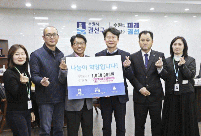 [NWS¹æ¼Û=Çѽ¸ñ ±âÀÚ]¼ö¿ø½Ã ±Ç¼±±¸ ¼ö¿øÃµ ÃàÁ¦ ÃßÁøÀ§¿øÈ¸(¼¼·ù1¡¤2¡¤3µ¿ ÁÖ¹ÎÀÚġȸÀå)´Â Áö³­ 19ÀÏ, ±Ç¼±±¸Ã»À» ¹æ¹®ÇÏ¿© 2025³â Ãë¾à°èÃþÀ» µ½±â À§ÇÑ ±âºÎ±Ý 100¸¸¿øÀ» Àü´ÞÇß´Ù. ¼ö¿øÃµ ÃàÁ¦ ÃßÁøÀ§¿øÈ¸´Â ¼¼·ù1µ¿¡¤2µ¿¡¤3µ¿ ÁÖ¡¦