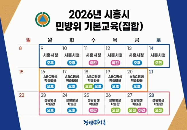 [NWS¹æ¼Û=Çѽ¸ñ ±âÀÚ]½ÃÈï½Ã´Â 3¿ù 9ÀϺÎÅÍ °ü³» ¹Î¹æÀ§´ë¿øÀ» ´ë»óÀ¸·Î ¡®2026³â ¹Î¹æÀ§ ±âº»±³À°¡¯À» ÁøÇàÇÑ´Ù. ¹Î¹æÀ§´ë¿øÀº Æí¼º ¿¬Â÷¿¡ µû¶ó ±³À° ¹æ½Ä°ú À̼ö ½Ã°£ÀÌ ´Ù¸£´Ù. 1~2³â Â÷ ´ë¿øÀº ÁýÇÕ±³À° 4½Ã°£À» À̼öÇØ¾ß Çϸç, 3¡¦
