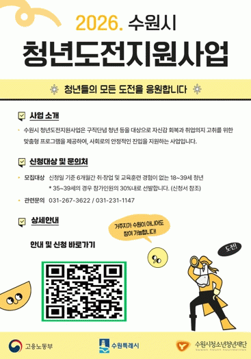 [»çȸ] ¡°Ãë¾÷ Áغñ û³â ÃÖ´ë 350¸¸¿ø Áö¿ø¡±¡¦¼ö¿ø½Ã û³âµµÀüÁö¿ø»ç¾÷ Âü°¡ÀÚ ¸ðÁý |2026. 03.08