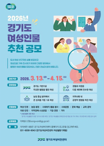 [»çȸ] °æ±âµµ¿©¼ººñÀü¼¾ÅÍ, 4¿ù 15ÀϱîÁö °æ±âµµ ¿©¼ºÀι° µµ¹Î °ø¸ð |2026. 03.13