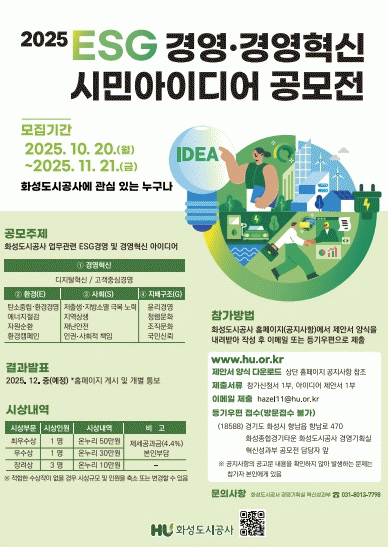 [NWS¹æ¼Û=Çѽ¸ñ ±âÀÚ]È­¼ºµµ½Ã°ø»ç´Â ¿À´Â 10¿ù 20ÀϺÎÅÍ 11¿ù 21ÀϱîÁö ¡®2025³â ESG°æ¿µ¡¤°æ¿µÇõ½Å ½Ã¹Î ¾ÆÀ̵ð¾î °ø¸ðÀü¡¯À» °³ÃÖÇÑ´Ù°í ¹àÇû´Ù. À̹ø °ø¸ðÀüÀº ESG ¹× Çõ½Å°æ¿µ °ü·Ã ½Ã¹ÎµéÀÇ Ã¢ÀÇÀûÀÎ ÀǰßÀ» °ø»çÀÇ °æ¿µ°úÁ¦¿¡ ¹Ý¡¦