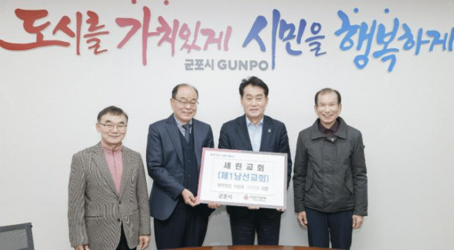 [NWS¹æ¼Û=Çѽ¸ñ ±âÀÚ]±ºÆ÷½Ã´Â Áö³­ 25ÀÏ ±ºÆ÷½Ã »êº»·Î¿¡ À§Ä¡ÇÑ ¼¼¸°±³È¸ ³²¼º ¼ºµµµé·Î ±¸¼ºµÈ Á¦1³²¼±±³È¸·ÎºÎÅÍ Çö±Ý 150¸¸¿øÀ» ±âŹ¹Þ¾Ò´Ù. Á¦1³²¼±±³È¸´Â 40¿©¸íÀÇ È¸¿øÀÌ ÀÖÀ¸¸ç ½Ê½ÃÀÏ¹Ý ±â±ÝÀ» ¸¶·ÃÇÏ¿© ¿¬¸»ÀÌ¸é ±ºÆ÷½Ã¿¡ ¼º¡¦