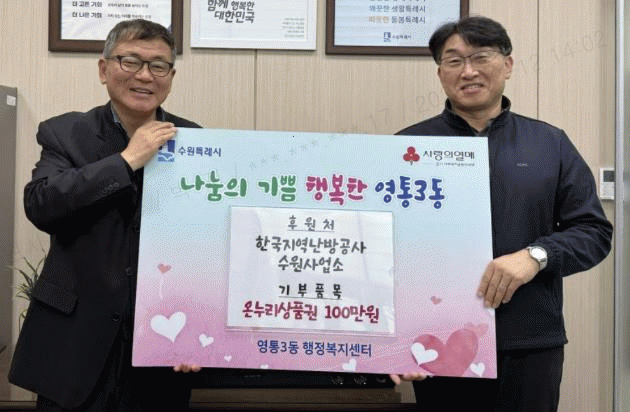 [»çȸ] ¼ö¿ø½Ã ¿µÅ뱸 ¿µÅë3µ¿, Çѱ¹Áö¿ª³­¹æ°ø»ç ¼ö¿ø»ç¾÷¼Ò¿¡ ¼³ ¸íÀý ¸Â¾Æ ¿Â´©¸®»óǰ±Ç 100¸¸ ¿ø ±âŹ¹Þ¾Æ |2026. 02.13