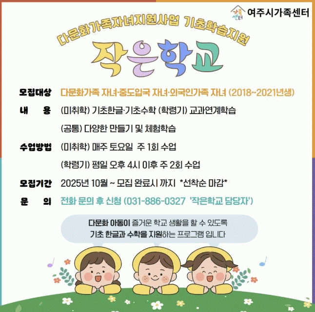 [»çȸ] ¿©Áֽð¡Á·¼¾ÅÍ, ¹è¿ò°ú ¼ÒÅëÀÌ ÇÔ²² ÀÚ¶ó´Â ´Ù¹®È­°¡Á· Áö¿ø ÇÁ·Î±×·¥ Âü¿©ÀÚ ¸ðÁý |2025. 10.17