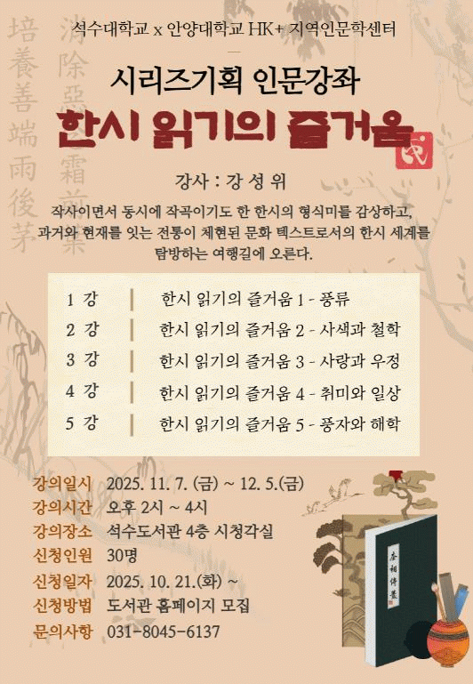 [NWS¹æ¼Û=Çѽ¸ñ ±âÀÚ]¾È¾ç½Ã ¼®¼öµµ¼­°üÀº ¾È¾ç´ëÇб³ HK+»ç¾÷´Ü Áö¿ªÀι®Çм¾ÅÍ¿Í ÇÔ²² ½Ã¸®Áî±âȹ Àι®°­ÁÂÀÇ ÀÏȯÀΡ®Çѽà ÀбâÀÇ Áñ°Å¿ò¡¯ °­Á¸¦ ¿À´Â 11¿ù 7ÀϺÎÅÍ 12¿ù 5ÀϱîÁö ¿î¿µÇÑ´Ù°í 17ÀÏ ¹àÇû´Ù. À̹ø °­Á¸¦ ÅëÇØ ¼ö°­»ý¡¦
