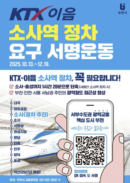 [NWS¹æ¼Û=Çѽ¸ñ ±âÀÚ]ºÎõ½Ã´Â ¼­Çؼ± KTX-ÀÌÀ½ ¿­Â÷ÀÇ ¼Ò»ç¿ª Á¤Â÷¸¦ ÃßÁøÇϱâ À§ÇØ 10¸¸ ¼­¸í¿îµ¿À» ½ÃÀÛÇß´Ù. À̹ø ¼­¸í¿îµ¿Àº 12¿ù 19ÀϱîÁö ÁøÇàµÇ¸ç, °ü³» ½Ã¹Î°ú ÀÎõ¡¤¼­¿ï ¼­³²±Ç ÁÖ¹ÎÀÇ ±¤¿ªÃ¶µµ Á¢±Ù¼ºÀ» ³ôÀ̰í, Áö¿ª »ê¾÷¡¦