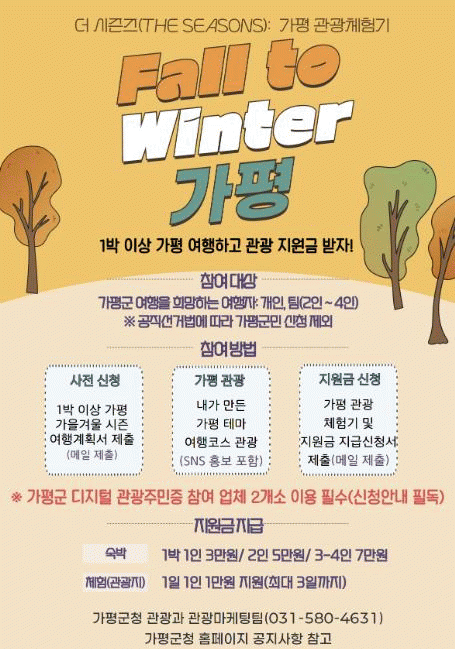 [NWS¹æ¼Û=Çѽ¸ñ ±âÀÚ]°¡Æò±ºÀº °¡À»°ú °Ü¿ïö Áö¿ª°ü±¤ Ȱ¼ºÈ­¸¦ À§ÇØ Ã¼·ùÇü °ü±¤°´¿¡°Ô ¼÷¹Úºñ¿Í üÇèºñ¸¦ Áö¿øÇÏ´Â ¡®´õ ½ÃÁðÁî(The Seasons) Çà»ç¸¦ ÃßÁøÇÑ´Ù°í 17ÀÏ ¹àÇû´Ù. ¡®´õ ½ÃÁðÁ´Â °¡Æò±ºÀÇ ´ëÇ¥ÀûÀΠü·ùÇü °ü±¤ ÇÁ·Î±×¡¦