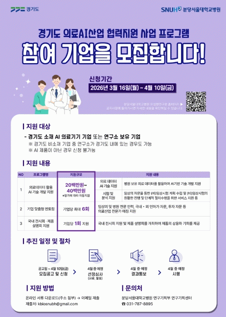 [»çȸ] °æ±âµµ, ÀΰøÁö´É ÀÇ·á±â±â °³¹ß¡¤»ó¿ëÈ­ Áö¿ø. Âü¿©±â¾÷ ¸ðÁý |2026. 03.30