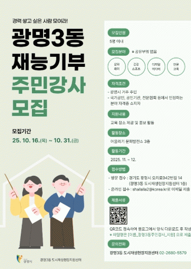 [NWS¹æ¼Û=Çѽ¸ñ ±âÀÚ]±¤¸í½Ã´Â ÁֹΠÀç´É ³ª´®À¸·Î Áö¿ª °øµ¿Ã¼ Ȱ·ÂÀ» ³ôÀ̱â À§ÇØ ±¤¸í3µ¿ ¾î¿ï¸®±â ¹®È­¹ßÀü¼Ò¿¡¼­ ±³À° ÇÁ·Î±×·¥À» ¿î¿µÇÒ ÁֹΠ°­»ç¸¦ ¸ðÁýÇÑ´Ù°í 17ÀÏ ¹àÇû´Ù. Á¢¼ö´Â ¿À´Â 31ÀϱîÁöÀ̸ç, ÁֹΠ±³À° ÇÁ·Î±×·¥ÀÇ ¡¦
