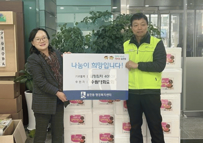 [NWS¹æ¼Û=Çѽ¸ñ ±âÀÚ]¼ö¿ø½Ã Àå¾È±¸ ¿¬¹«µ¿Àº Áö³­ 24ÀÏ ±¤±³»ê¿ï±³È¸·ÎºÎÅÍ ¾î·Á¿î ÀÌ¿ôµéÀ» À§ÇÑ ±èÀå±èÄ¡ 50¹Ú½º¸¦ Àü´Þ¹Þ¾Ò´Ù. ±¤±³»ê¿ï±³È¸´Â ¸Å³â ²ÙÁØÇÑ ³ª´® Ȱµ¿À» À̾î¿À¸ç Áö¿ª»çȸ µ¹º½¿¡ ¾ÕÀå¼­°í ÀÖÀ¸¸ç, À̹ø¿¡ ±âºÎ¹ÞÀº¡¦
