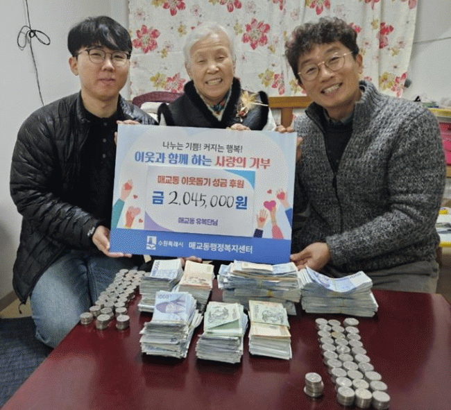 [NWS¹æ¼Û=Çѽ¸ñ ±âÀÚ]Áö³­ 26ÀÏ, ¼ö¿ø½Ã ÆÈ´Þ±¸ ¸Å±³µ¿Àº °ü³» °ÅÁÖÇÏ´Â ÆóÁö¼öÁý ¾î¸£½ÅÀÌ ¿ÃÇØ ÆóÁö µîÀ» ÆÈ¾Æ ¸ðÀº µ·À» ¾î·Á¿î ÀÌ¿ôÀ» À§ÇØ ½á´Þ¶ó¸ç ¸Å±³µ¿ ÇàÁ¤º¹Áö¼¾ÅÍ¿¡ ÀÌ¿ôµ½±â ¼º±ÝÀ» ±âºÎÇß´Ù°í ¹àÇû´Ù. ±âºÎÀÚ´Â Æò¼Ò¿¡µµ¡¦