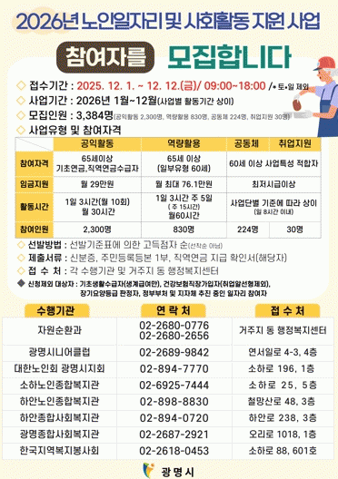 [NWS¹æ¼Û=Çѽ¸ñ ±âÀÚ]±¤¸í½Ã°¡ ¾î¸£½ÅÀÇ °Ç°­ÇÑ ³ëÈÄ¿Í »çȸÂü¿© È®´ë¸¦ À§ÇØ ³ëÀÎ ÀÏÀÚ¸® Âü¿© ±âȸ¸¦ ³ÐÈù´Ù. ½Ã´Â ¿À´Â 12¿ù 1ÀϺÎÅÍ 12ÀϱîÁö ¡®2026³â ³ëÀÎÀÏÀÚ¸® ¹× »çȸȰµ¿ Áö¿ø»ç¾÷¡¯ Âü¿©ÀÚ 3õ384¸íÀ» ¸ðÁýÇÑ´Ù. ³»³âµµ »ç¡¦