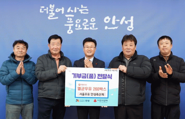 [NWS¹æ¼Û=Çѽ¸ñ ±âÀÚ]¾È¼º½Ã´Â Áö³­ 12¿ù 29ÀÏ, ¼­¿ï¿ìÀ¯ ¾È¼ºÃà»ê°è¿Í ¢ß½º¸¶Æ®¿¡½ºÁö°¡ ¿¬¸»À» ¸Â¾Æ ¾î·Á¿î ÀÌ¿ôÀ» À§ÇÑ ³ª´®À» ½ÇõÇß´Ù°í ¹àÇû´Ù. ¼­¿ï¿ìÀ¯ ¾È¼ºÃà»ê°è´Â ¸ê±Õ¿ìÀ¯ 260¹Ú½º(24°³ÀÔ 200ml, ±âºÎ°¡¾× 400¸¸ ¿ø »ó´ç)¸¦¡¦