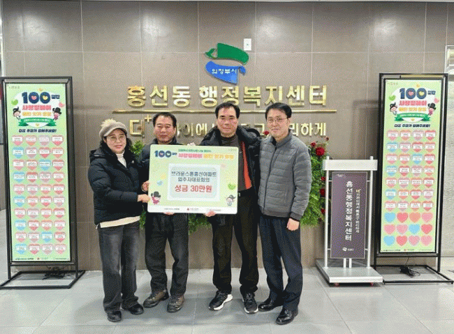 [NWS¹æ¼Û=Çѽ¸ñ ±âÀÚ]ÀÇÁ¤ºÎ½Ã Èï¼±µ¿ÇàÁ¤º¹Áö¼¾ÅÍ´Â 12¿ù 31ÀÏ ºê¶ó¿î½ºÅæÈï¼±¾ÆÆÄÆ® ÀÔÁÖÀÚ´ëǥȸÀǰ¡ ¡®100Àϰ£ »ç¶û¸±·¹ÀÌ ¹èÅÏ Àձ⡯ÀÇ ÀÏȯÀ¸·Î ¼º±Ý 30¸¸ ¿øÀ» ±âŹÇß´Ù°í ¹àÇû´Ù. À̹ø ±âŹÀº ¿¬¸»À» ¸Â¾Æ Áö¿ª»çȸÀÇ ¾î·Á¿î ¡¦