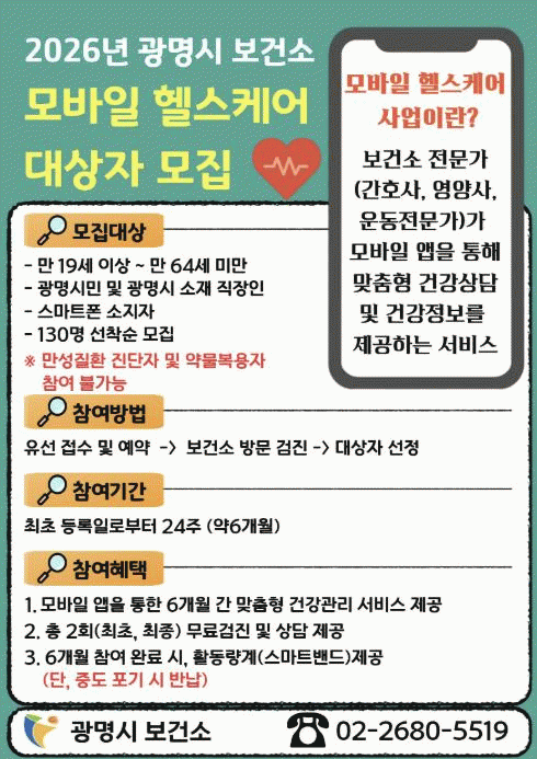 [»çȸ] ±¤¸í½Ã, ¼Õ¸ñ¿¡¼­ ½ÃÀÛÇÏ´Â °Ç°­°ü¸® '¸ð¹ÙÀÏ ÇコÄɾî' Âü¿©ÀÚ ¸ðÁý |2026. 02.20
