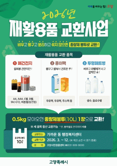 [NWS¹æ¼Û=Çѽ¸ñ ±âÀÚ]°í¾çƯ·Ê½Ã ´ö¾ç±¸ ⸪µ¿Àº ÁֹεéÀÇ ÀÚ¿ø ÀçȰ¿ë Âü¿©¸¦ È®´ëÇÏ°í ¿Ã¹Ù¸¥ ºÐ¸®¹èÃâ ¹®È­¸¦ Á¤Âø½Ã۱â À§ÇØ ¡®2026³â ÀçȰ¿ëǰ ±³È¯»ç¾÷¡¯À» ¿î¿µÇÑ´Ù°í ¹àÇû´Ù. ÀçȰ¿ëǰ ±³È¯»ç¾÷Àº »ýȰ ¼Ó¿¡¼­ ½±°Ô ½ÇõÇÒ ¡¦