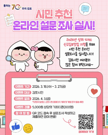 [NWS¹æ¼Û=Çѽ¸ñ ±âÀÚ]±èÆ÷½Ã´Â Áö¿ª ¿Ü½Ä¹®È­ ¼öÁذú ½Ã¹Î ¸¸Á·µµ¸¦ ³ôÀ̱â À§ÇØ ¡®2026 ±èÆ÷¸ÀÁý ¼±Á¤À» À§ÇÑ ½Ã¹Î Ãßõ ¿Â¶óÀÎ ¼³¹®Á¶»ç¡¯¸¦ ¿À´Â 3¿ù 18ÀϺÎÅÍ 27ÀϱîÁö ½Ç½ÃÇÑ´Ù. À̹ø Á¶»ç´Â ½Ã¹ÎµéÀÇ ½ÇÁ¦ ÀÌ¿ë °æÇèÀ» ¹ÙÅÁÀ¸·Î¡¦