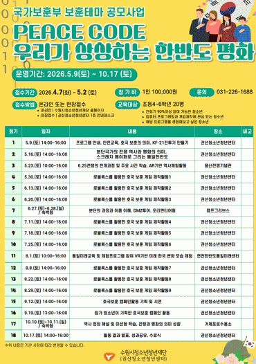 [NWS¹æ¼Û=Çѽ¸ñ ±âÀÚ]¼ö¿ø½Ãû¼Ò³âû³âÀç´Ü ±Ç¼±Ã»¼Ò³âû³â¼¾ÅÍ´Â µðÁöÅÐ ±â¼ú°ú È£±¹º¸ÈÆ ¿ª»ç¸¦ °áÇÕÇÑ ÀÌ»ö ÇÁ·ÎÁ§Æ® ¡®PEACE CODE : ¿ì¸®°¡ »ó»óÇÏ´Â Çѹݵµ ÆòÈ­¡¯ÀÇ Âü°¡ û¼Ò³âÀ» ¸ðÁýÇÑ´Ù. À̹ø ÇÁ·Î±×·¥Àº 2026³â ±¹°¡º¸ÈƺΠ¡¦