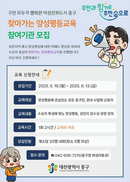 [NWS¹æ¼Û=Çѽ¸ñ ±âÀÚ]´ëÀü Áß±¸´Â ±¸¹ÎÀÇ ¼ºÀÎÁö·Â Çâ»ó°ú ¾ç¼ºÆòµî¿¡ ´ëÇÑ ÀÌÇØ ÁõÁøÀ» À§ÇØ ¿î¿µÇϴ¡®Ã£¾Æ°¡´Â ¾ç¼ºÆòµî ±³À°¡¯Âü¿©±â°üÀ» 6¿ù 13ÀϱîÁö ¸ðÁýÇÑ´Ù°í ¹àÇû´Ù. À̹ø ±³À°Àº ÁֹΠ´«³ôÀÌ¿¡ ¸ÂÃá ½ÇÈ¿¼º ÀÖ´Â ¾ç¼ºÆòµî ±³¡¦