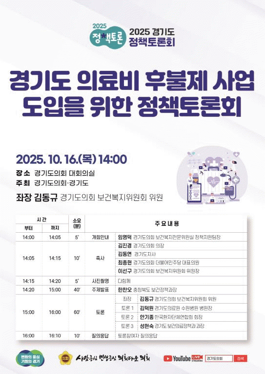 [Áö¿ªÁ¤Ä¡] °æ±âµµÀÇȸ ±èµ¿±Ô ÀÇ¿ø, °æ±âµµ ÀÇ·áºñ ÈĺÒÁ¦ »ç¾÷ µµÀÔÀ» À§ÇÑ Á¤Ã¥Åä·Ðȸ °³ÃÖ |2025. 10.14