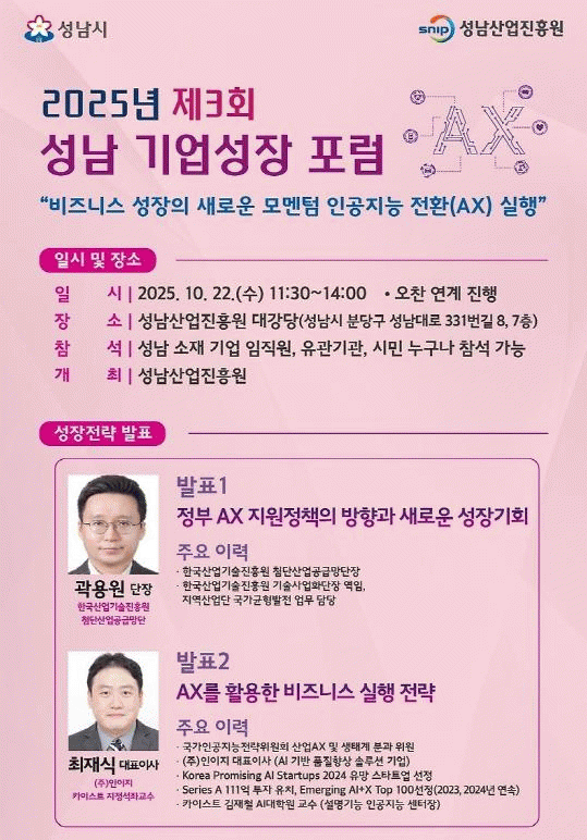 [NWS¹æ¼Û=Çѽ¸ñ ±âÀÚ]¼º³²»ê¾÷ÁøÈï¿øÀº ¿À´Â 10¿ù 22ÀÏ 11½Ã 30ºÐºÎÅÍ ¡®ÀΰøÁö´É Àüȯ ½ÇÇà Àü·«¡¯À» ÁÖÁ¦·Î 2025³â Á¦3ȸ ¡®¼º³²±â¾÷¼ºÀåÆ÷·³¡¯À» °³ÃÖÇÑ´Ù. À̹ø Æ÷·³Àº ¼º³²½Ã Áß¼Ò±â¾÷ÀÇ ¼º°øÀûÀÎ ¡®ÀΰøÁö´É Àüȯ(AI Transformati¡¦