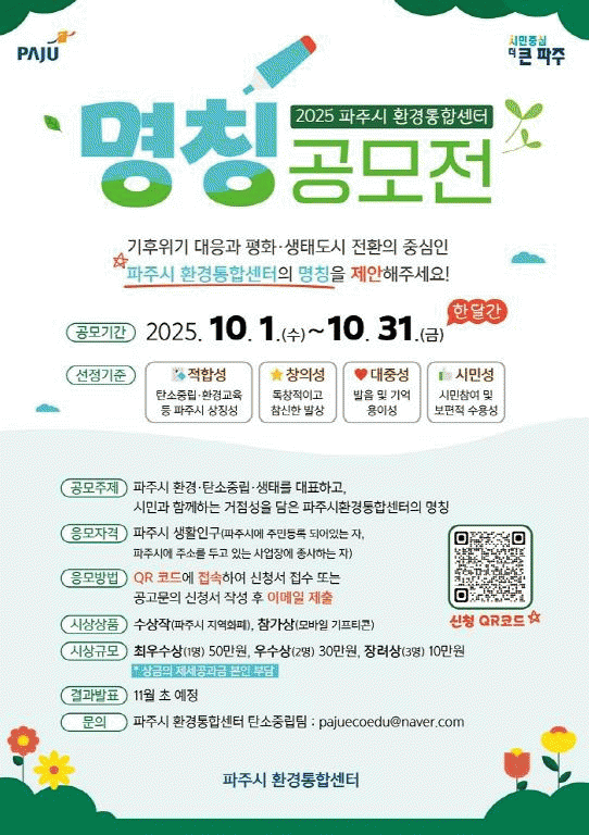 [NWS¹æ¼Û=Çѽ¸ñ ±âÀÚ]ÆÄÁֽà ȯ°æÅëÇÕ¼¾Åʹ ȯ°æ°ú ź¼ÒÁ߸³ µîÀÇ Àǹ̸¦ ´ãÀº ¼¾ÅÍÀÇ »õ À̸§À» ½Ã¹Î°ú ÇÔ²² Á¤Çϱâ À§ÇØ ¿À´Â 31ÀϱîÁö ¸íĪ °ø¸ðÀüÀ» ÁøÇàÇÑ´Ù. À̹ø °ø¸ðÀüÀº ½Ã¹Î°ú ÇÔ²²Çϴ ź¼ÒÁ߸³¡¤È¯°æ±³À° °ÅÁ¡¼¾Åͷμ­ÀÇ ¡¦