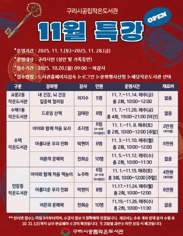 [»çȸ] ±¸¸®½Ã, °ø¸³ ÀÛÀº µµ¼­°ü ½Ã¹Î ¸ÂÃãÇü Ư°­ Âü¿©ÀÚ ¸ðÁý |2025. 10.16