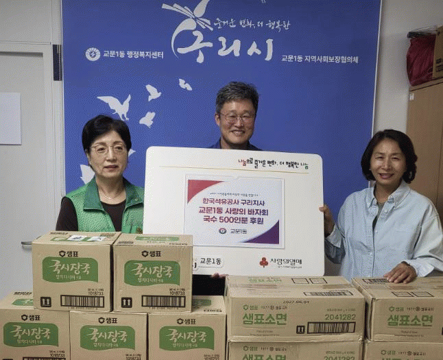 [NWS¹æ¼Û=Çѽ¸ñ ±âÀÚ]±¸¸®½Ã ±³¹®1µ¿ ÇàÁ¤º¹Áö¼¾ÅÍ´Â 10¿ù 15ÀÏ Çѱ¹¼®À¯°ø»ç ±¸¸®Áö»ç°¡ ±³¹®1µ¿ »ç¶ûÀÇ ¹ÙÀÚȸ Çà»ç¿¡ Áö¿ª ³» ¾î·Á¿î ÀÌ¿ôÀ» À§ÇØ ±¹¼ö 500ÀκÐÀ» ³Â´Ù°í ¹àÇû´Ù. À̹ø ¹ÙÀÚȸ´Â ±³¹®1µ¿ »õ¸¶À»ºÎ³àȸ¿Í »õ¸¶À»ÁöµµÀÚ¡¦