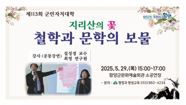 [NWS¹æ¼Û=Çѽ¸ñ ±âÀÚ]ÇԾ籺Àº ¿À´Â 5¿ù 29ÀÏ ¸ñ¿äÀÏ ¿ÀÈÄ 3½Ã, ¹®È­¿¹¼úȸ°ü ¼Ò°ø¿¬Àå¿¡¼­ ¡®2025³â Á¦113ȸ ±º¹ÎÀÚÄ¡´ëÇС¯À» °³ÃÖÇÑ´Ù°í ¹àÇû´Ù. À̹ø °­¿¬Àº ¡®Áö¸®»êÀÇ ²É-öÇаú ¹®ÇÐÀÇ º¸¹°¡¯À̶ó´Â ÁÖÁ¦·Î, °í¿î ÃÖÄ¡¿ø, ÀϵΡ¦
