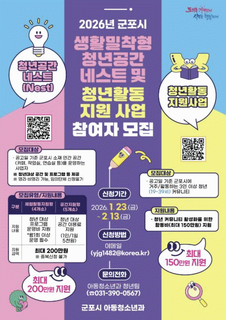 [NWS¹æ¼Û=Çѽ¸ñ ±âÀÚ]±ºÆ÷½Ã´Â Áö¿ª û³âµéÀÇ ´Ù¾çÇÑ È°µ¿À» Áö¿øÇÏ´Â »ýȰ¹ÐÂøÇü û³â°ø°£ ¡®³×½ºÆ®(Nest)¡¯ ¹× û³âȰµ¿Áö¿ø »ç¾÷ Âü¿©ÀÚ¸¦ 2¿ù 13ÀϱîÁö °¢°¢ ¸ðÁýÇÑ´Ù. ¸ÕÀú ¿ÃÇØ ´õ¿í È®´ëµÇ´Â ¡®»ýȰ¹ÐÂøÇü û³â°ø°£ ³×½ºÆ®(Nest¡¦