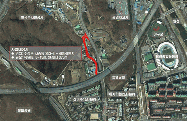 [NWS¹æ¼Û=Çѽ¸ñ ±âÀÚ]¼º³²½Ã ¼öÁ¤±¸ »ç¼Ûµ¿ 353-3¹øÁö~484-8¹øÁö ÀÏ¿ø¿¡ ¿À´Â 2030³â±îÁö 375m ±æÀÌÀÇ µµ·Î °³¼³ »ç¾÷ÀÌ ÃßÁøµÈ´Ù. ¼º³²½Ã´Â ¼öÁ¤±¸ »ç¼Ûµ¿ ÀÏ´ë ÁֹεéÀÇ ¸¸¼ºÀûÀÎ ÅëÇà ºÒÆíÀ» ÇØ¼ÒÇϱâ À§ÇÑ ¡®»ç¼Û1Åë µµ½Ã°èȹ½Ã¼³(¡¦