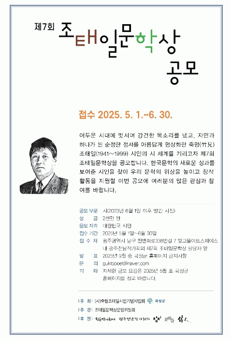 [NWS¹æ¼Û=Çѽ¸ñ ±âÀÚ] °î¼º Ãâ½ÅÀ¸·Î Çѱ¹½Ã´ÜÀÇ ´ëÇ¥ÀûÀÎ ¹ÎÁ·¡¤¹ÎÁß½ÃÀÎÀ¸·Î ²ÅÈ÷´Â Á¶ÅÂÀÏ ½ÃÀÎÀÇ »î°ú ½Ã ¼¼°è¸¦ ±â¸®´Â Á¦7ȸ Á¶ÅÂÀϹ®ÇÐ»ó °ø¸ð°¡ ½ÃÀ۵ƴÙ. (»ç)Á×ÇüÁ¶ÅÂÀϽÃÀαâ³ä»ç¾÷ȸ¿Í °î¼º±ºÀÌ ÁÖÃÖÇϰí, Çѱ¹ÀÛ°¡È¸ÀÇ¡¦