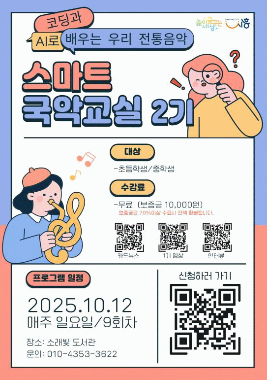 [NWS¹æ¼Û=Çѽ¸ñ ±âÀÚ]½ÃÈï½Ã´Â ´Ù¹®È­°¡Á· ¹®È­È°µ¿ Áö¿ø»ç¾÷ÀÇ ÀÏȯÀ¸·Î ¡®½º¸¶Æ® ±¹¾Ç±³½Ç¡¯ 2±â¸¦ ¿î¿µÇÑ´Ù. ÀÌ ÇÁ·Î±×·¥Àº ºí·ÏÄÚµù°ú ÀΰøÁö´É(AI)À» Á¢¸ñÇØ ±¹¾Ç±â¸¦ Á÷Á¢ Á¦ÀÛÇÏ°í ¿¬ÁÖÇÒ ¼ö ÀÖµµ·Ï ±¸¼ºµÆ´Ù. ¾î¸°ÀÌ¿Í Ã»¼Ò³âµé¡¦