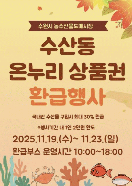 [»çȸ] ¼ö¿ø½Ã³ó¼ö»ê¹°µµ¸Å½ÃÀå, 11¿ù 19~23ÀÏ ¿Â´©¸®»óǰ±Ç ȯ±ÞÇà»ç |2025. 11.14