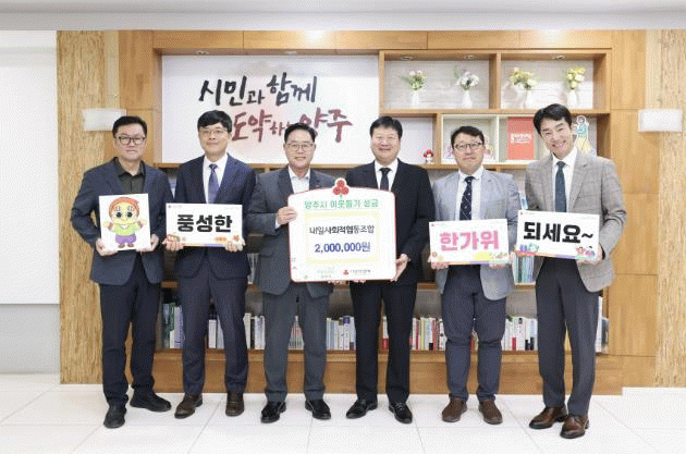 [NWS¹æ¼Û=Çѽ¸ñ ±âÀÚ]¾çÁֽð¡ Áö³­ 30ÀÏ ³»ÀÏ»çȸÀûÇùµ¿Á¶ÇշκÎÅÍ ¼º±Ý 200¸¸¿øÀ» ±âŹ¹Þ¾Ò´Ù. À̹ø ±âŹ½Ä¿¡´Â ³»ÀÏ »çȸÀûÇùµ¿Á¶ÇÕ ¼Û¿µÁø ÀÌ»çÀåÀ» ºñ·ÔÇØ Àº±âÈÆ ÀÌ»ç, ¾çÁÖ½ÃÀå¾ÖÀκ¸È£ÀÛ¾÷Àå ÁÖ¼ºÈñ ±¹Àå, ¼ÛÆÄÀμºÀå¾ÖÀκ¹Áö°ü¡¦