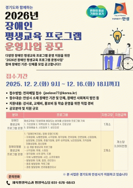 [»çȸ] ¾È¼º½Ã, 2026³â Àå¾ÖÀÎ Æò»ý±³À° ÇÁ·Î±×·¥ ¿î¿µ °ø¸ð»ç¾÷ °ø°í |2025. 12.02
