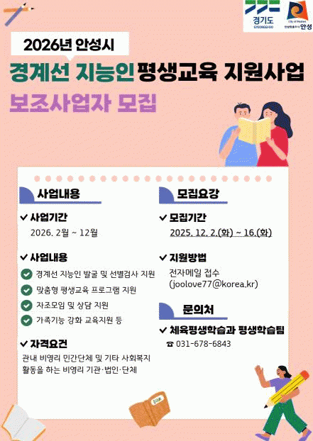 [NWS¹æ¼Û=Çѽ¸ñ ±âÀÚ]¾È¼º½Ã´Â °ü³» °æ°è¼± Áö´ÉÀÎÀÇ Áø´Ü¡¤ÇнÀ¡¤°¡Á· Áö¿øÀ» ü°èÈ­ÇÏ°í Æ÷¿ëÀû ÇнÀȯ°æÀ» Á¶¼ºÇϱâ À§ÇØ 12¿ù 2ÀϺÎÅÍ 16ÀϱîÁö'2026³â °æ°è¼± Áö´ÉÀÎ Æò»ý±³À° Áö¿ø»ç¾÷'À» ¼öÇàÇÒ º¸Á¶»ç¾÷ÀÚ¸¦ °ø¸ðÇÑ´Ù. °æ°è¼± ¡¦