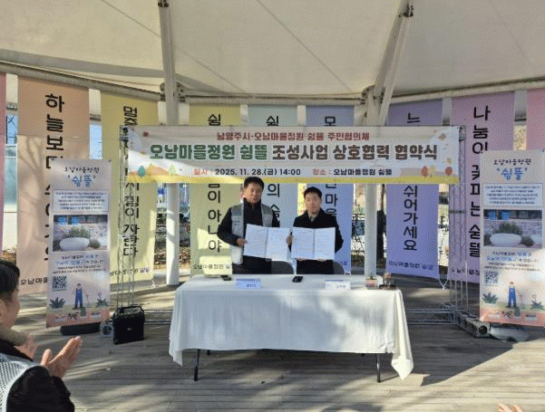 [NWS¹æ¼Û=Çѽ¸ñ ±âÀÚ]³²¾çÁֽô Áö³­´Þ 28ÀÏ 2025³â ¸¶À»Á¤¿ø Á¶¼º »ç¾÷ ´ë»óÁöÀÎ ¿À³²À¾ ¾çÁö¸® 723-4¹øÁö ÀÏ¿ø¿¡¼­ ÁÖ¹ÎÇùÀÇüÀÎ ¡®¿À³²¸¶À»Á¤¿ø ½°¶ã¡¯°ú »óÈ£Çù·Â Çù¾à½ÄÀ» °³ÃÖÇß´Ù. Áö³­ 11¿ù ÇùÀÇü°¡ Á¶¼ºÇÑ ¡®¿À³²¸¶À»Á¤¿ø ½°¡¦