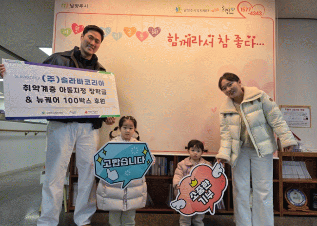 [NWS¹æ¼Û=Çѽ¸ñ ±âÀÚ]³²¾çÁֽô Áö³­ 10ÀÏ ´Ù»êµ¿ ¼ÒÀç ¹«¿ªÈ¸»çÀÎ ¢ß½½¶ó¹ÙÄÚ¸®¾Æ°¡ ÀåÇÐ±Ý 100¸¸ ¿ø°ú ¿µ¾çº¸ÃæÀ½·á(´ºÄɾî) 100¹Ú½º¸¦ ³²¾çÁֽà µ¿ºÎÈñ¸ÁÄɾÅÍ¿¡ ±âŹÇß´Ù°í ¹àÇû´Ù. À̹ø ±âŹÀº ¾î·Á¿î ÀÌ¿ôµéÀÌ °Ü¿ïÀÇ Â÷°¡¿ò¡¦