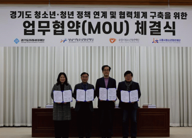 [NWS¹æ¼Û=Çѽ¸ñ ±âÀÚ]°æ±âµµ¹Ì·¡¼¼´ëÀç´ÜÀº 12ÀÏ ¿¾ °æ±âµµÃ»»ç ½Å°ü 4Ãþ ´ëȸÀǽǿ¡¼­ ¼ö¿ø¡¤¼º³²¡¤½ÃÈï½Ãû¼Ò³âû³âÀç´Ü°ú ¡®°æ±âµµ û³â Á¤Ã¥ ¿¬°è ¹× Çù·Âü°è ±¸Ãà ¾÷¹«Çù¾à¡¯À» ü°áÇß´Ù. Çù¾àÀÇ ÇÙ½ÉÀº ¡ãû³â ºÐ¾ß °øµ¿»ç¾÷ ±â¡¦