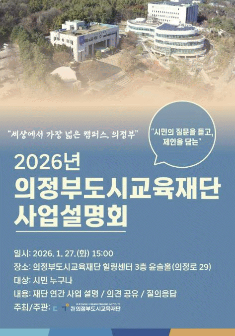 [NWS¹æ¼Û=Çѽ¸ñ ±âÀÚ]ÀÇÁ¤ºÎµµ½Ã±³À°Àç´ÜÀº 1¿ù 27ÀÏ ¿ÀÈÄ 3½Ã, Àç´ÜÀÇ ¿¬°£ »ç¾÷ ¹æÇâÀ» ½Ã¹Îµé°ú °øÀ¯Çϰí ÀǰßÀ» ³ª´©±â À§ÇÑ '2026³â ÀÇÁ¤ºÎµµ½Ã±³À°Àç´Ü »ç¾÷¼³¸íȸ'¸¦ °³ÃÖÇÑ´Ù. À̹ø »ç¾÷¼³¸íȸ´Â ÀÇÁ¤ºÎµµ½Ã±³À°Àç´Ü Èú¸µ¼¾ÅÍ ¡¦
