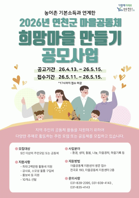 [NWS¹æ¼Û=Çѽ¸ñ ±âÀÚ]¿¬Ãµ±º ¸¶À»°øµ¿Ã¼Áö¿ø¼¾ÅͰ¡ ³ó¾îÃ̱⺻¼Òµæ°ú ¿¬°èÇÑ ¡®2026³â Èñ¸Á¸¶À» ¸¸µé±â Áֹΰø¸ð»ç¾÷¡¯ Âü¿© °øµ¿Ã¼¸¦ ¸ðÁýÇÑ´Ù. ¡®Èñ¸Á¸¶À» ¸¸µé±â °ø¸ð»ç¾÷¡¯Àº Áö¿ªÀÇ ÀÎÀû¡¤¹°Àû ÀÚ¿øÀ» Ȱ¿ëÇØ ÁֹΠ½º½º·Î ¸¶À»ÀÇ ¡¦
