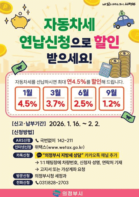 [»çȸ] ÀÇÁ¤ºÎ½Ã, 1¿ù ÀÚµ¿Â÷¼¼ ¿¬³³ ½Ã 4.5% ÇÒÀÎ |2026. 01.15