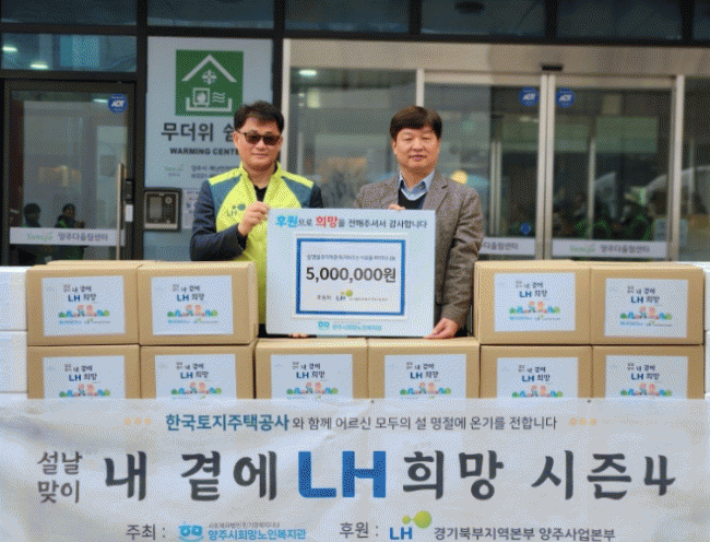 [NWS¹æ¼Û=Çѽ¸ñ ±âÀÚ]¾çÁÖ½ÃÈñ¸Á³ëÀκ¹Áö°üÀÌ ¼³ ¸íÀýÀ» ¸Â¾Æ LH ¾çÁÖ»ç¾÷º»ºÎÀÇ ÈÄ¿øÀ¸·Î 2¿ù 11ÀÏ Áö¿ª ³» Ãë¾à°èÃþ µ¶°Å ¾î¸£½ÅÀ» À§ÇÑ ¼³ ¸íÀý ³ª´® Ȱµ¿ ¡®¼³³¯ ¸ÂÀÌ ³» °ç¿¡ LH Èñ¸Á ½ÃÁð 4¡¯¸¦ ÁøÇàÇß´Ù°í ¹àÇû´Ù. À̹ø ³ª´®Àº ¡¦