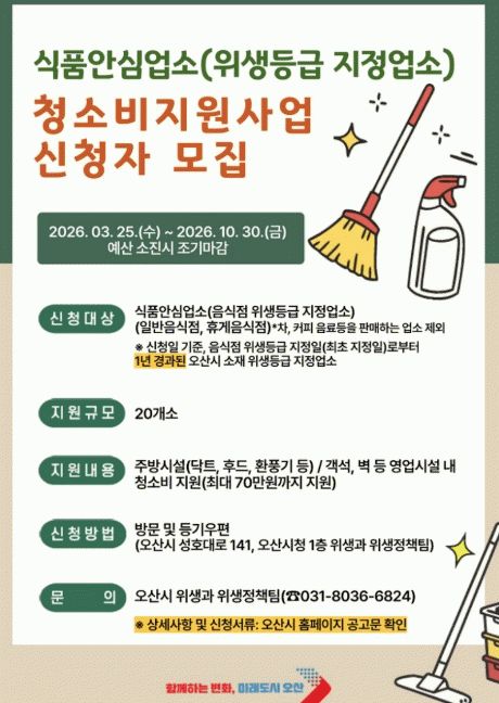 [»çȸ] ¿À»ê½Ã, ½Äǰ¾È½É¾÷¼Ò ´ë»ó û¼Òºñ ÃÖ´ë 70¸¸¿ø Áö¿ø |2026. 03.26