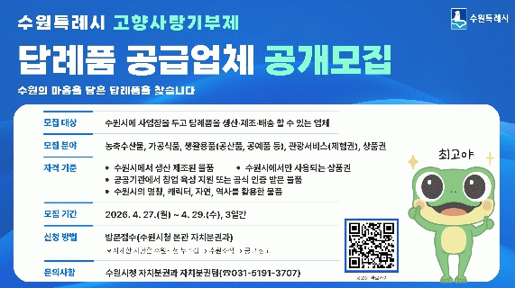 [»çȸ] ¼ö¿øÆ¯·Ê½Ã, °íÇâ»ç¶û±âºÎÁ¦ ´ä·Êǰ °ø±Þ¾÷ü °ø¸ð |2026. 04.14