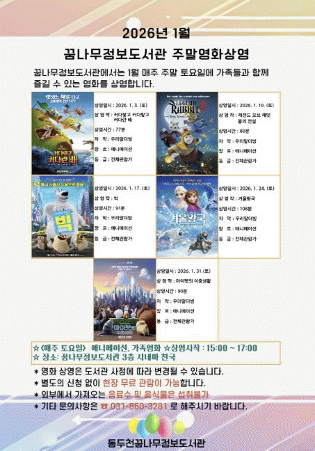 [»çȸ] µ¿µÎõ½Ã ²Þ³ª¹«Á¤º¸µµ¼­°ü, 1¿ù ÁÖ¸»¿µÈ­ ¾Ö´Ï¸ÞÀÌ¼Ç ¹× °¡Á·¿µÈ­ »ó¿µ |2025. 12.23