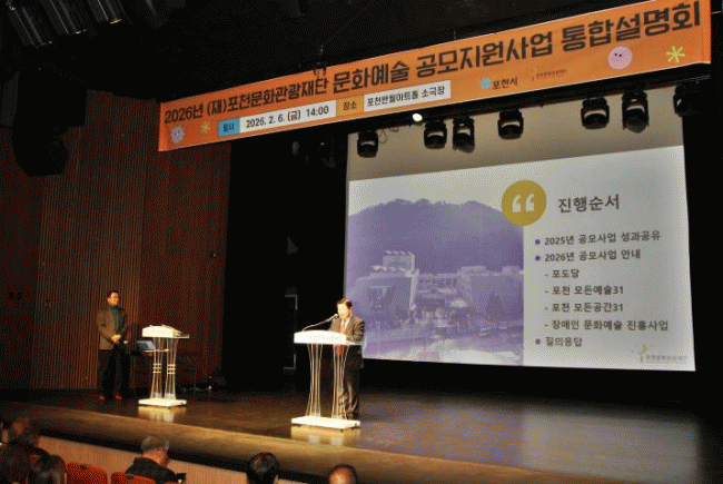 [NWS¹æ¼Û=Çѽ¸ñ ±âÀÚ]Æ÷õ¹®È­°ü±¤Àç´ÜÀº Áö³­ 6ÀÏ Æ÷õ¹Ý¿ù¾ÆÆ®È¦ ¼Ò±ØÀå¿¡¼­ ¡®2026³â ¹®È­¿¹¼ú °ø¸ðÁö¿ø»ç¾÷ ÅëÇÕ¼³¸íȸ¡¯¸¦ °³ÃÖÇß´Ù. À̹ø ÅëÇÕ¼³¸íȸ´Â 2026³â ÃßÁø ¿¹Á¤ÀÎ ¹®È­¿¹¼ú Áö¿ø»ç¾÷ Àü¹ÝÀ» °øÀ¯Çϰí Áö¿ª ¿¹¼úÀεé°úÀÇ¡¦